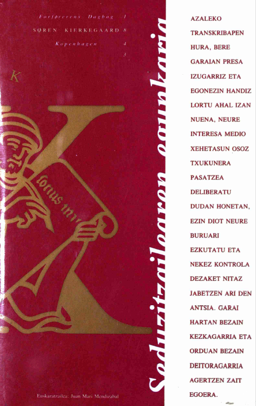 Seduzitzailearen egunkaria [Interneteko baliabidea] / Soren Kierkegaard ; [euskaratzailea, Juan Mari Mendizabal ; berrikuslea, Joxe Azurmendi ; hitzaurregilea, José María Valverde]