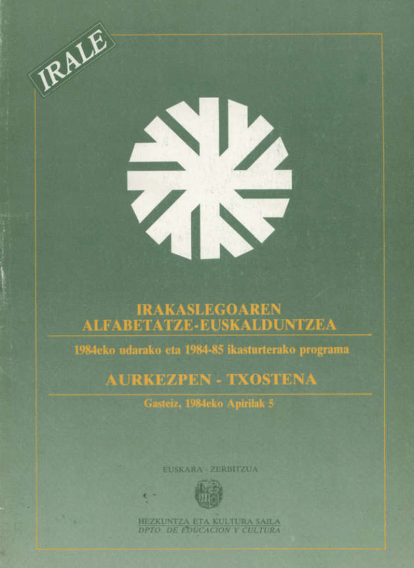 IRALE : Irakaslegoaren Alfabetatze-Euskalduntzea : 1984eko udarako eta 1984-85 ikasturterako programa : aurkezpen-txostena = IRALE: Alfabetización y euskaldunización del profesorado. Programa para el verano de 1984 y curso escolar 1984-85. Folleto informativo