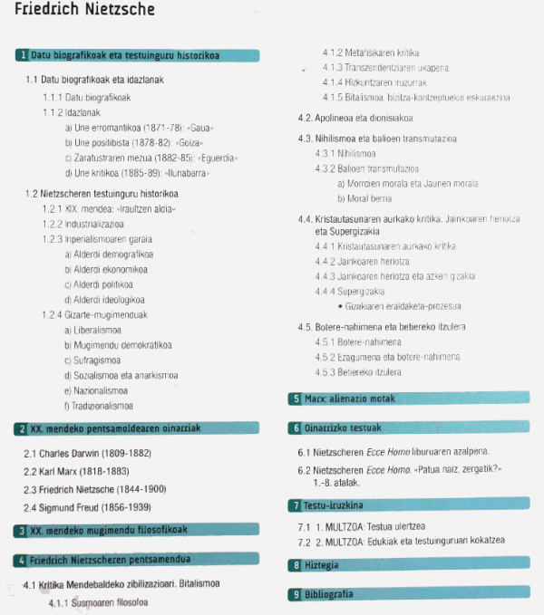 Nietzsche [XIX. mendeko Filosofia] : Filosofia : Batxilergoa 2 / egileak, Martin Aurrekoetxea Olabarri, M. Lourdes Villar Rodrigo, Alfredo Olarra Aristegi ; koordinazioa, Martin Aurrekoetxea Olabarri ; [testuaren zuzenketa, Hitzurun Hizkuntza Zerbitzuak eta Leire Calle Arrinda]