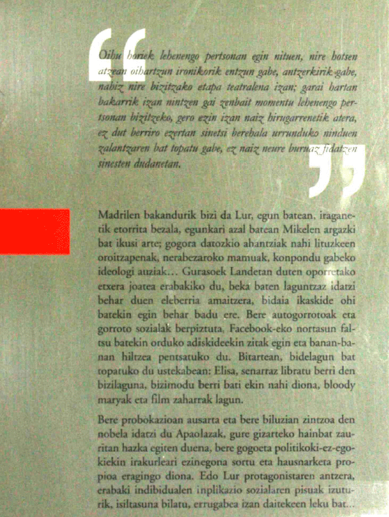 Madrilen bakandurik bizi da Lur, egun batean, iraganetik etorrita bezala, egunkari azal batean Mikelen argazki bat ikusi arte; gogora datozkio ahantziak nahi lituzkeen oroitzapenak, nerabezaroko mamuak, konpondu gabeko ideologi auziak Gurasoek Landetan duten oporretako etxera joatea erabakiko du, beka baten laguntzaz idatzi behar duen eleberria amaitzera, bidaia ikaskide ohi batekin egin behar badu ere. Bere autogorrotoak eta gorroto sozialak berpiztuta, Facebook-eko nortasun faltsu batekin orduko adiskideekin zitak egin eta banan-banan hiltzea pentsatuko du. Bitartean, bidelagun bat topatuko du ustekabean: Elisa, senarraz libratu berri den bizilaguna, bizimodu berri bati ekin nahi diona, bloody maryak eta film zaharrak lagun. Bere probokazioan ausarta eta bere biluzian zintzoa den nobela idatzi du Apaolazak, gure gizarteko hainbat zauritan hazka egiten duena, bere gogoeta politikoki-ez-egokiekin irakurleari ezinegona sortu eta hausnarketa propioa eragingo diona. Edo Lur protagonistaren antzera, erabaki indibidualen inplikazio sozialaren pisuak izuturik, isiltasuna bilatu, errugabea izan daitekeen leku bat...