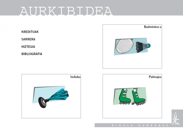 Kirol alternatiboak (II) : indiaka, badminton-a, patinajea / egilea, Zigor Gartzia Arregi (Soin Hezkuntzan diplomatua) ; [marrazkilaria, Armando (Badminton-a eta patinajea) eta Unai Ceciaga (Indiaka)]