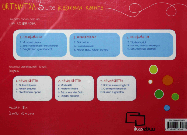 1. hiruhilabeteko lan koadernoa: 1.- Munduari biraka. 2.- Zatoz udazkeneko erakusketara! 3.- Dringilindron, gaur Gabon! -- 2. hiruhilabeteko lan koadernoa: 4.- Guk beti jai. 5.- Horrelakoa naiz! 6.- Kalean gora, kalean behera! -- 3. hiruhilabeteko lan koadernoa: 7.- Txio-txio txoriak. 8.- Kox-kox, mailuaz iltzeak joz. 9.- San Juan sua, oporrak!
