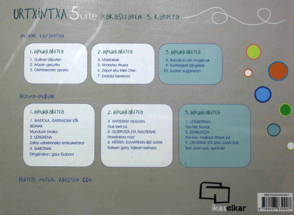 Ipuinak laminatan: Babarrun-ale magikoak; Galtxagorri langileak; Suaren sugarretan -- Horma-irudiak: Udaberrian; Eraikuntza; Oporrak eta San Joan sua -- , abestien CDa (abestiak 9) - Hiztegi mutua