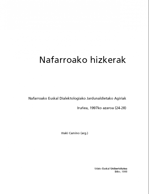 Nafarroako hizkerak [Interneteko baliabidea] : Nafarroako Euskal Dialektologiako Jardunaldietako Agiriak : Iruñea, 1997ko azaroa (24-28) / Iñaki Camino (arg.)