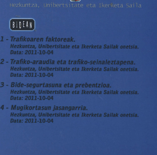 1.- Trafikoaren faktoreak; 2.- Trafiko-araudia eta trafiko-seinaleztapena; 3.- Bide-segurtasuna eta prebentzioa; 4.- Mugikortasun jasangarria