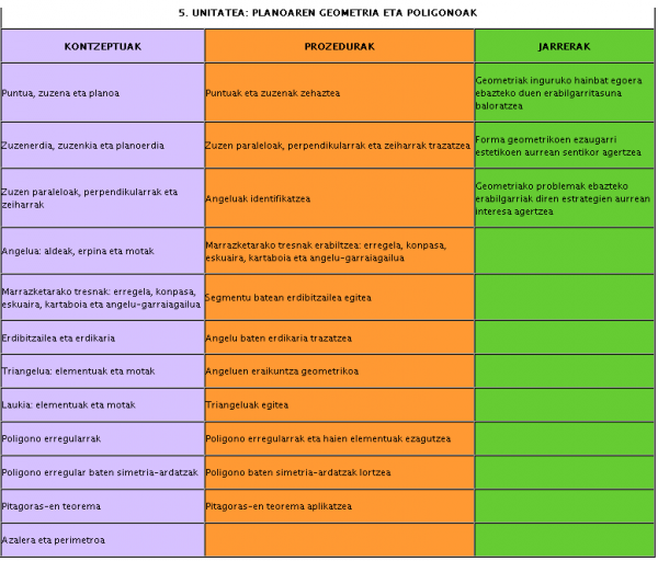 Ohikoa da ikaslearen inguruan gorputz geometrikoak egotea. Hori dela eta, errealitatearen elementu horiek erabiliko ditugu planoak eta poligonoak lantzeko. Unitate honetan, ikasleak besteak beste, zuzenak, planoko puntuak, angeluak eta angeluen neurria, irudi geometrikoak, poligonoak eta zenbait irudiren azalera nahiz poligonoa kalkulatzeko problemak landuko ditu. Horretarako, zenbaki hamartarrekin egindako eragiketak eta kontzeptu geometrikoak menderatu beharko ditu, angeluak identifikatzeko edo bolumenak eta gorputz geometrikoen edukierak aurkitzeko.