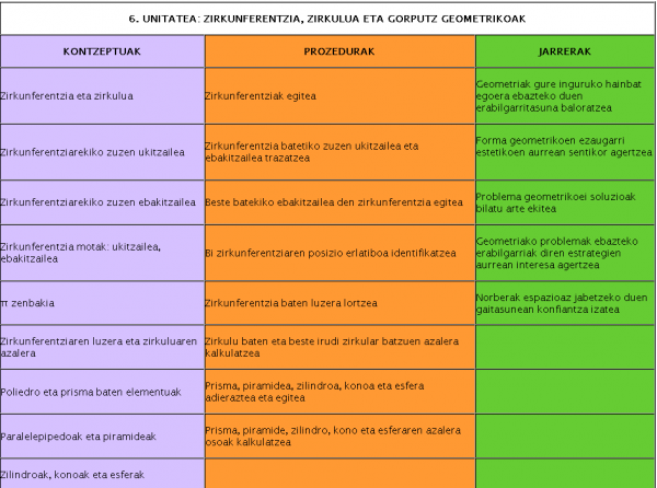 Gorputz geometrikoak bezala, irudi zirkularrak ere askotan agertzen dira ikaslearen inguruan. Hori dela eta, arreta berezia jarriko diegu unitate honetan, garrantzi bereko bestelako irudiak alde batera utzi gabe, hala nola poliedro erregularrak. Unitate honetan hainbat elementu landuko ditu ikasleak: zirkunferentziaren elementuak, zirkunferentzien eta zuzenen arteko posizio erlatiboak, sektore zirkularrak, azalerak eta poliedroak. Horretarako, zenbaki hamartarrekin egindako eragiketak eta kontzeptu geometrikoak menderatu beharko ditu, angeluak identifikatzeko edo bolumenak eta gorputz geometrikoen edukierak aurkitzeko.
