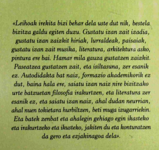 Gehiegi izango da esatea euskaldun guztion hezkuntza sentimentalean badela Xabier Leteren kanta bat baino gehiago? Ez dut uste. Euskaltzaleon soinu bandan behintzat badira haren ahotsean nahiz beste kantari batzuenean euria bezain leun sartu zaizkigun poesia zati melodiaz lagunduak.Liburu honetan Inazio Mujika Iraolak egin duena izan da Xabier Leteri egin zizkioten hainbat elkarrizketa bildu, transkribatu eta Leteri berari aukera eman bere bizitzaren berri eman diezagun, bere lanaren berri, bere bizipen eta oroitzapenena, bere fedearena, bere adiskidetasunena, iritzi politikoak, kantuari eta poesiari buruzko iritziak, gure herriari buruzkoak eta herritarrei buruzkoak. Fedea eta Jainkoa, sufrimendua eta heriotza...Elkarrizketagileak desagertu egiten dira, liburua prestatu duen editorea ere bai, eta Xabier Letek berak hartzen du protagonismoa.