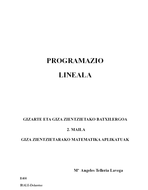 Programazio Lineala [Interneteko baliabidea] : Gizarte eta giza zientzietako batxilergoa : Giza zientzietako matematika aplikatuak / M.ª Angeles Telleria Lavega