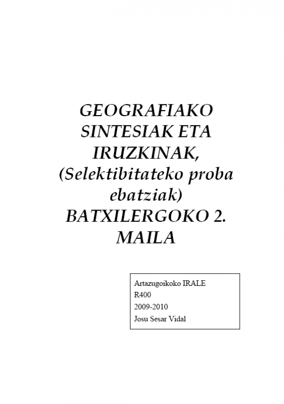 Geografiako sintesiak eta iruzkinak [Interneteko baliabidea] : (Selektibitateko proba ebatziak) : Batxilergoa 2 / Josu Sesar Vidal