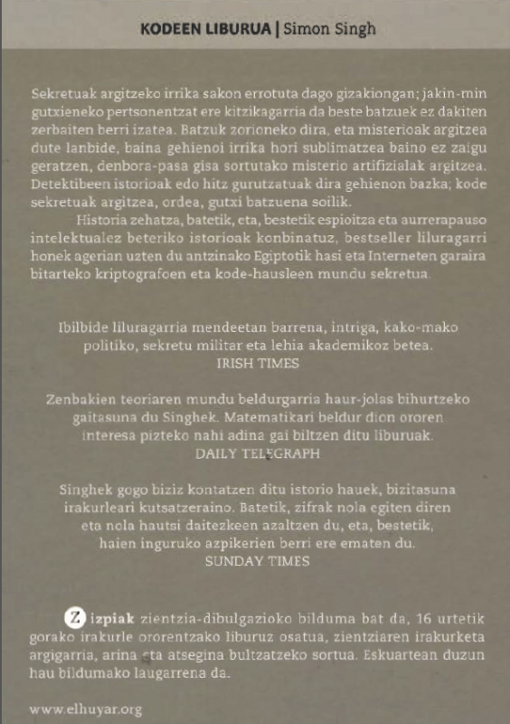 Kodetzeko lehenengo sistemetatik hasi eta gaur egun erabiltzen diren sistemetara arteko historia kontatzen da: Egiptotik hasi eta Interneten garaira bitarteko kriptografoen eta kode-hausleen mundu sekretua, hain zuzen ere. Besteak beste, kontatzen da nola Eskoziako Maria Estuardo erregina eraila izan zen enkriptazio ahul batean konfiantza izateagatik; II. Mundu Gerran alemaniarrek erabili zuten Enigma kodetzeko makinaren historia ere aurkituko du irakurleak; eta, nola ez, Interneteko PGP enkriptazio-sistema ere aztertzen da... Hainbat hizkuntzatara itzulia izan da eta, kasu askotan, best seller izatera iritsi da. Elhuyarrek euskaraz jarri du eskuragarri, Gipuzkoako Foru Aldundiaren Euskara Sailaren laguntzarekin. Z izpiak zientzia-dibulgazioko bildumako laugarren liburua da. Bilduma hori 16 urtetik gorako irakurleei zuzendua dago, eta zientziaren irakurketa argigarria, arina eta atsegina bultzatzea du xede.