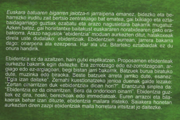 "Euskara batuaren bigarren jaiotza"-ri jarraipena emanez, bidezko eta beharrezko iruditu zait bertsio zentratuago bat ematea, gai txikiago eta eztabaidagarriago guztiak ezabatu eta arazo nagusietara bakarrik mugatuz. Azken batez, gai horietantxe baitakust euskararen norabidearen gako erabakiorra. Arazo nagusiok "ebidentzia" moduan aurkezten ditut, halakoxeak direla uste dudalako: ebidentziak. Ebidentzien aurrean, jarrera bakarra dago: onarpena ala ezezpena. Har ala utz. Bitarteko eztabaidak ez du onura handirik.Ebidentzia ez da azaltzen, hain gutxi esplikatzen. Proposamen ebidenteak aurkeztu bakarrik egin daitezke. Era zorrotzago edo ez-zorrotzagoan, argiago edo ez argiagoan, begi bistan jarri bakarrik. Batzuek burua biratuko dute, muzinka edo biraoka. Beste batzuek arreta jarriko dute, esanez: "Egia izan daiteke". Zernahi kuestionatzeko jenioa duenak dena galde lezake: "Zertan oinarritzen duk "ebidentzia" dioan hoti?". Erantzuna sinpea da: "Ebidentzia ez da oinarritzen. Bera da ondorioen oinarri". Ebidentzia guztiak ez dira, noski berezkoak edo inmediatoak. Euren arrazoi eta bilakaerak behar izan dituzte, ebidentzia mailara iristeko. Saiaketa honetan aurkezten diren zazpi ebidentziak maila horretara iritsitzat jo daitezke.