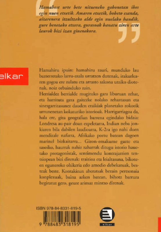 Hamahiru ipuin: hamahiru zauri, munduko lau bazterretako larru-azala urratzen dutenak, irakurlearen gogoa ere zulatu eta arrasto sakona utziko diotenak, noiz orbainduko zain. Herrialdez herrialde mugituko gara liburuan zehar, eta harrituta gera gaitezke nolako zehaztasun eta sinesgarritasunez dauden eraikiak planetako zokorik urrunenetan kokaturiko istoriak. Harrigarriagoa da, hala ere, giza geografian barrena egindako bidaia: Londresa au-pair doan ezpeletarra, Indian neba joankiaren bila dabilen laudioarra, K-2ra igo nahi duen mendizale nafarra, Afrikako portu batean dagoen marinel bizkaitarra... Gizon-emakume gazte eta sasoiko, haurrak nahiz zaharrak ditugu istorio hauetako protagonistak, sentimendu kontrajarrien tentsiopean bizi direnak: traizioa eta leialtasuna, bikoteen eguneroko ohikeria edo amodio debekatuak, besteak beste. Kontakizun aberatsak bezain pertsonaia konplexuak, baina azken batean, bihotz barrura begiratuz gero, geure arimaz mintzo direnak.