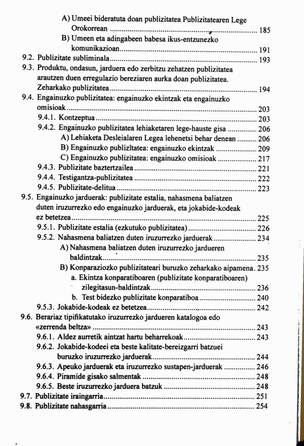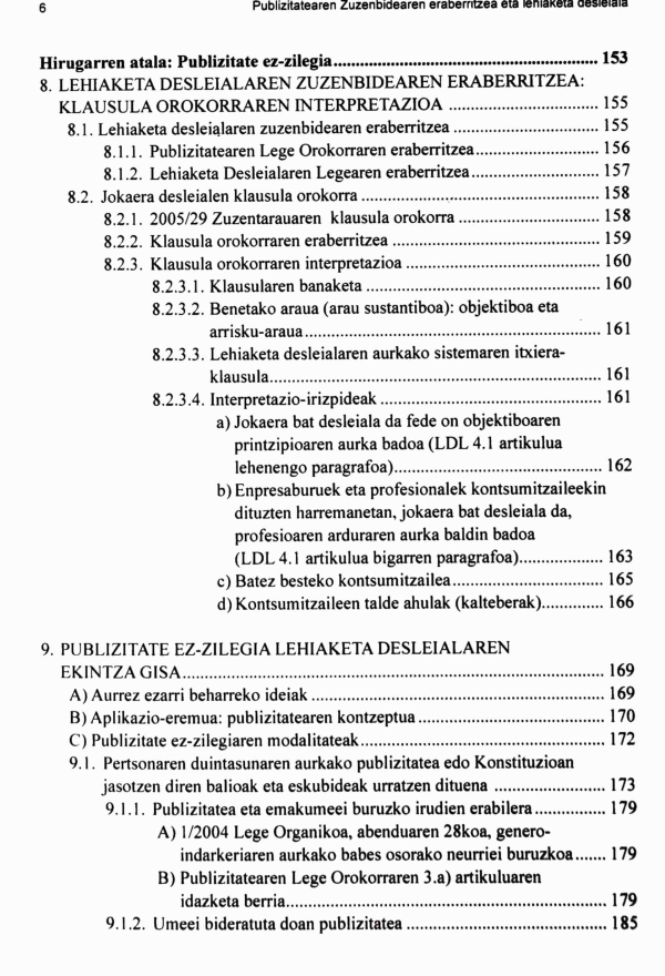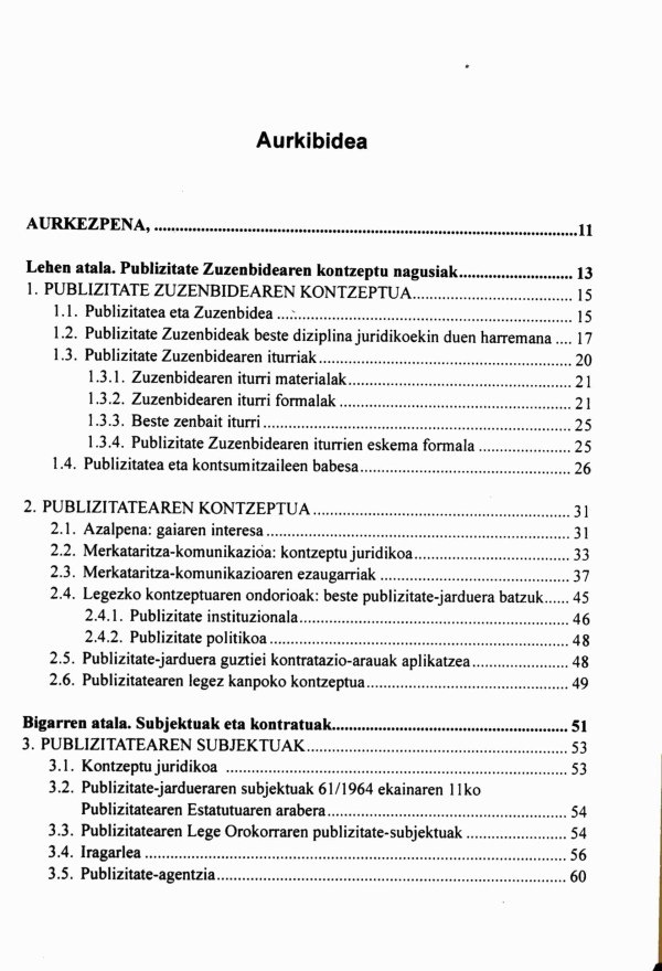 Publizitate eta Lehiaketa Desleialaren Zuzenbideari buruzko liburu honek gai bi horien inguruko oinarri juridikoak modu ulergarri eta erraz batean azaltzea du lehenengo helburu. Oinarrizko kontzeptu juridikoen garapenarekin batera, hainbat adibide praktiko eta adierazgarri ere jasotzen dira.Liburua Publizitate eta Harreman Publikoetako graduatuentzat sortua da bereziki, graduko programan jasotzen diren edukiei erantzuten baitie. Edonola ere, testu egokia da publizitateari buruzko legeria ezagutu nahi duten adituentzat eta sektoreko egitura juridikoa ezagutu nahi duen edonorentzat.Egiturari dagokionez, lanak lau atal bereizten ditu. Lehenengoan, publizitatearen kontzeptu juridikoa eta horren legezko erregulazioaren zergatia azaltzen da. Bigarren atalean, profesionalentzat interesgarria den gaia garatzen da, hau da, publizitatearen subjektuak eta horien arteko erlazio juridikoak, publizitate-kontratuak direla medio. Hirugarren atalari dagokionez, publizitate ez-zilegia aurkezten da hainbat ataletan sailkaturik: Konstituzioan jasotako eskubideen aurkako publizitatea, publizitate subliminala, arau berezien aurka doan publizitatea eta jokaera desleialak publizitatean (engainuzkoak eta erasotzaileak). Azkenik, publizitatearen kontrol judiziala eta autorregulazioa (jokaera oneko kodeak) aztertzen dira.