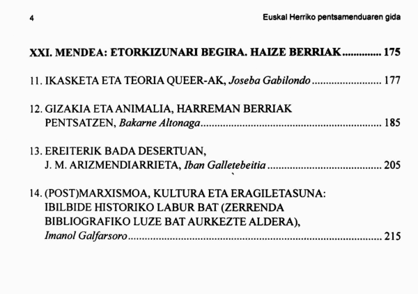 Liburu honen sorrera eskutik helduta dator aurten euskal pentsamenduaren inguruan garrantzitsua eta berritzailea izan den beste proiektu batekin, 2012-2013 abian jarri berri den «Euskal Herriko Pentsamendu Kritikoa XX. eta XXI. mendeetan» graduondokoarekin alegia. Graduondoko hori, esku artean dugun gida hau bezala, euskal eremu akademikoan antzematen dugun hutsune bat betetzeko helburuarekin sortu da.Euskal pentsamenduaren inguruko irizpiderik ezak, sistematizazio- eta transmisio-lanik ez egoteak, pentsamendu eta pentsalari arrotzen lanak bakarrik ikasi eta lantzea dakarkigu. Gureak, bertakoak, ezagutu gabe eta ahanzturan galtzen direlarik. Euskal pentsalaririk inoiz izan ez den irudi okerra zabaltzen da eta pentsamendua beti herri txiki batentzat inportatu beharreko zerbait dela ulertarazi. Baina hori errealitatearen desitxuraketa interesatu bat baino ez da.Liburu honek, umil eta muga guztiekin bada ere, aipatu hutsune hori neurri apal batean betetzen hasi nahiko luke. Euskal Herriko pentsamenduaren azterketa eta eraikuntzan ezinbestekoa suertatzen da edozeinentzat eskuragarri eta ulergarri izango den idatzizko materiala produzitzea.