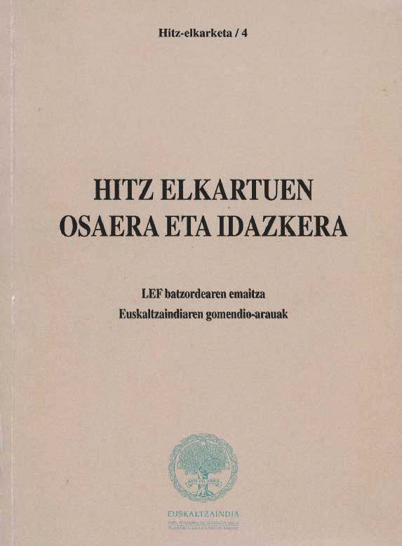 Hitz elkartuen osaera eta idazkera [Interneteko baliabidea] : LEF batzordearen emaitza, Euskaltzaindiaren gomendio-arauak / [egilea, Mikel Zalbide] ; LEF batzordearen lanak
