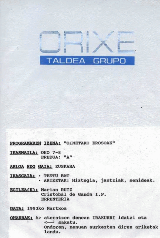 Oinetako erosoak [diskete] / Marian Ruiz (Cristobal de Gamon Ikastetxea, Errenteria) : OHOko 7-8 ("A" eredua)