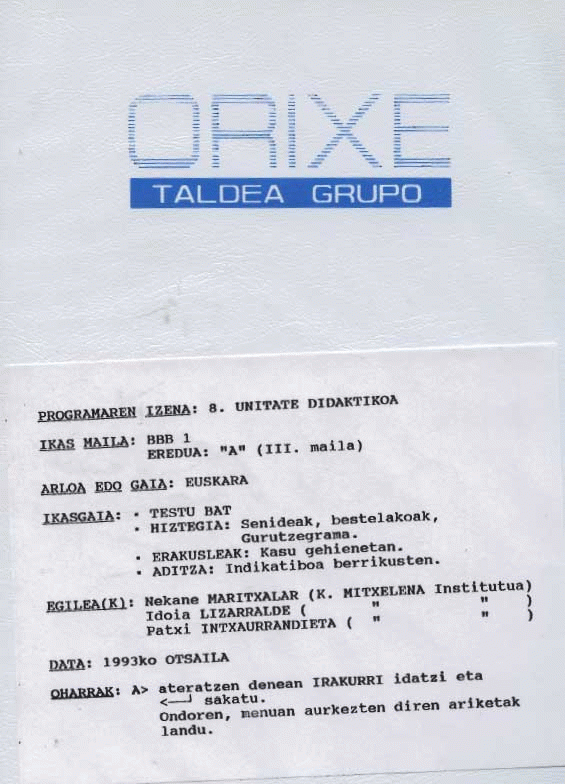 Euskara A [BBB 1 ] / Nekane Maritxalar, Idoia Lizarralde, Patxi Intxaurrandieta [Diskete] : 8. unitate didaktikoa