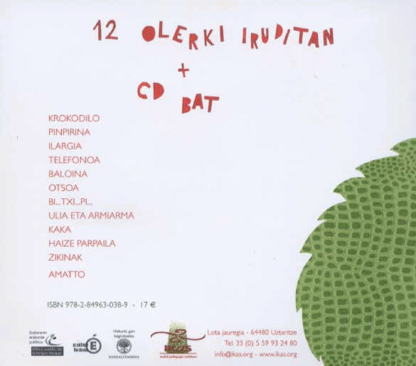 Liburu-CD bat aurkezten zaigu izen horren pean. Bertan hainbat poesia eta hitz joko agertzen dira. Ilustrazio koloretsuez lagunduta, dena da jostailu : hitza, irudia eta hizkiak. Poesiak errezitatuak agertzen dira CDan, oso ahoskera argi eta zuzenean. Musikak ere laguntzen du, osotasun jostalari bat lortzen delarik.