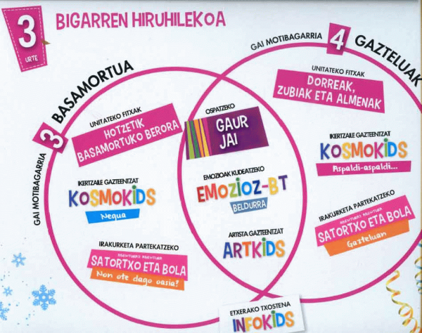 KIDS proiektuan, lan globalaren alde egiten da, eta bi unitate daude hiruhileko bakoitzean. Edukiak aurkezteko, ikasleentzat motibagarriak eta erakargarriak diren gaiak erabili dira, urte-sasoia eta urtaroak ahaztu gabe. Fitxa bakoitzean iradokizunak daude irakaslearentzat, eta ate bat irekitzen zaio ezagutzari, barrutik kanporantz heziz; alegia, haurren jakin-minetik eta interesetatik abiatuz, inguruko mundua ezagutzera iristeko.
