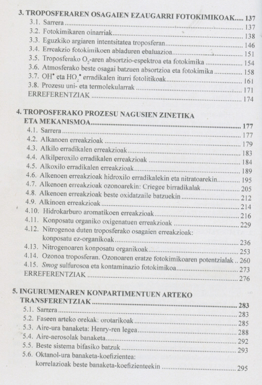 Klimaren aldaketa, ozono-geruzaren suntsiketa, euri azidoak... azken urteotan borborka dauden gaiak dira, eta mass medietan sarri agertzen dira haien ondorio hurbil eta kaltegarriak saihesteko edo gainditzeko egindako ikerketen berriak.Liburu honetan, ingurugiroaren azterketaren hurbilketa sistematikoa aurkezten da. Bertan, ingurumenaren konpartimentu desberdinetan, mekanismoak azaltzen dira, fisikoak eta kimikoak.Gauza jakina da ezen prozesu horiek naturan gertatzen direla baina gizakiaren parte-hartzeak, batez ere Industrializazio Arotik hona, irauli egin dituela aurretik zeuden orekak. Batzuetan, desoreka horiek ez dute ondorio larririk, baina beste batzuetan ondorioak denbora luzeetara eta eskualde zabaletara (eta Lur osora ere) hedatzen dira.