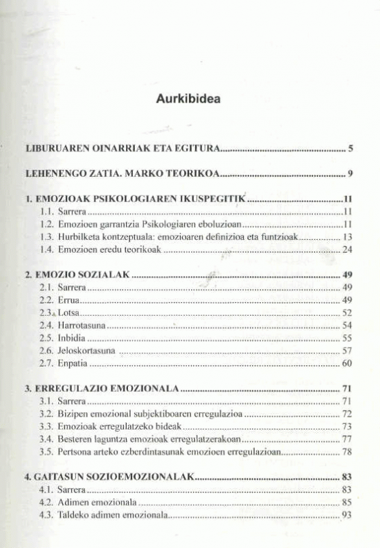 zatian, oinarrizko ezagutza teorikoak jorratzen dira lau ataletan banandurik. Lehenengoan, oinarrizko emozioak (poza, beldurra, haserrea, tristura, nazka, sorpresa/interesa) ikuspegi psikologiko batetik aztertzen dira eta, alderdi anitzeko definizioak aurkezteaz gain, emozioen funtzioetan, eredu teorikoetan eta bizipen emozional subjektiboan