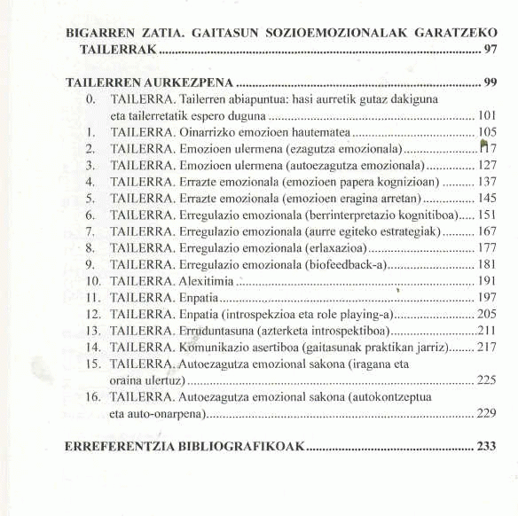 enpatia) lantzen dira beraien arrazoiak eta ondorioak aztertuz. Hirugarren atalean, erregulazio emozionala lantzen da desatseginak izan daitezkeen fenomeno emozionalen ondorioak erregulatzeko bideak aztertuz. Azkenik, laugarren atalean, gaitasun sozioemozionaletan sakontzen dugu adimen emozionalak biltzen dituen oinarrizko gaitasun emozionalak azalduz.