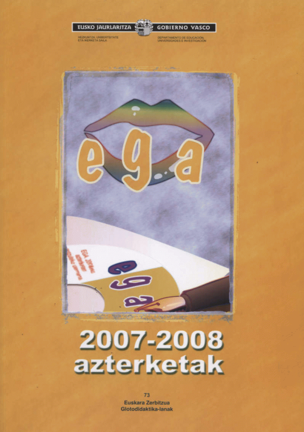 TestuaSerie(ak): Euskara Zerbitzua. Glotodidaktika-lanak (Hezkuntza Saila) ; ; 73 | EGA azterketak (Hezkuntza Saila) ; ; 13Publication details: Vitoria-Gasteiz : Eusko Jaurlaritzaren Argitalpen Zerbitzu Nagusia, 2008Edizioa: 1. argitDeskribapen fisikoa: 263 or. z.-b. argk., ir. ; 30 cm + 1 disko konpaktu (CD-DA)ISBN: - 978-84-457-2847-5