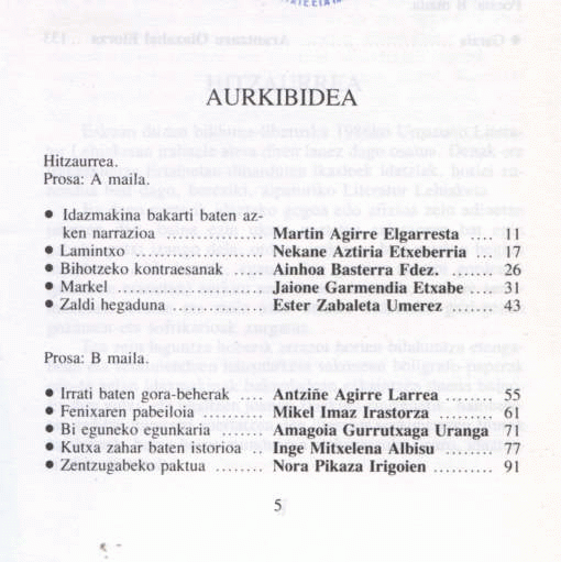 Eskuan duzun bilduma-liburuska 1986ko Urruzuno Literatur Lehiaketan irabazle atera diren lanez dago osatua, Denak ere irakaskuntza ertainetan diharduten ikasleek idatziak, horiei zuzendua baitago, bereziki, aipaturiko Literatur Lehiaketa. 1986koan 10 lan saritu dira prosan eta 5 poesiako sailean.