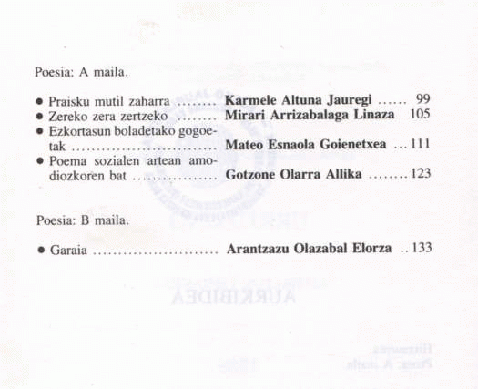 Gaia(k): Generoa/Forma:Sareko errekurtsoak:Adina / Maila: Eskuan duzun bilduma-liburuska 1986ko Urruzuno Literatur Lehiaketan irabazle atera diren lanez dago osatua, Denak ere irakaskuntza ertainetan diharduten ikasleek idatziak, horiei zuzendua baitago, bereziki, aipaturiko Literatur Lehiaketa. 1986koan 10 lan saritu dira prosan eta 5 poesiako sailean.