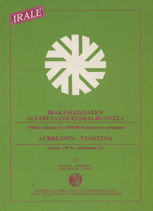 IRALE : Irakaslegoaen Alfabetatze-Euskalduntzea : 1988ko udarako eta 1988-89 ikasturterako programa : aurkezpen-txostena = IRALE: Alfabetización y euskaldunización del profesorado. Programa para el verano de 1988 y curso escolar 1988-89. Folleto informativo.