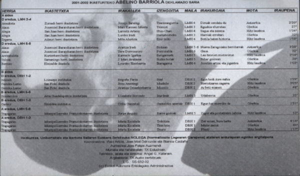2001-2002 ikasturteko Barriola Deklamazio Saria [Kasetea] / koordinazioa, Iñaki Artola, Joxe Miel Odriozola eta Blanca Castaño