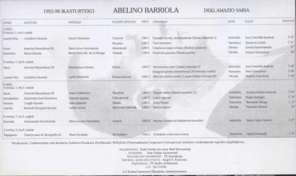 1995-1996 ikasturteko Barriola Deklamazio Saria [Kasetea] / koordinazioa, Iñaki Artola eta Joxe Mari Berasategi