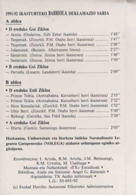 1991-1992 ikasturteko Barriola Deklamazio Saria [Kasetea] / koordinazioa, Iñaki Artola...[et al.]