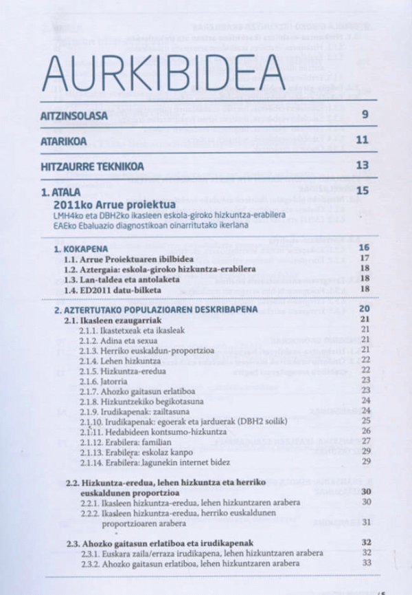 TestuaPublication details: Vitoria-Gasteiz : Eusko Jaurlaritzaren Argitalpen Zerbitzu Nagusia, 2013Edizioa: 1. argitDeskribapen fisikoa: 290 or. : graf. ; 27 cm + 1 CD-ROM (Ikasleak hiztun, 2011ko Arrue Proiektua = Comportamiento lingüístico del alumnado, Proyecto Arrue 2011 = Talking Pupils, the Arrue Project 2011)ISBN: - 978-84-457-3315-8