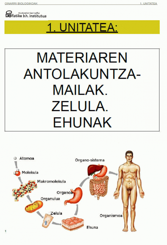 Aurkibidea: 1- Materia, Zelula eta Ehunak; 2.- Planoak eta Ardatzak; 3.- Hezurrak; 4.- Giharrak; 5.- Giltzadurak; 6.- Zirkulazio Aparatua; 7.- Ekosistemak ; 8.- Arnas Sistema.