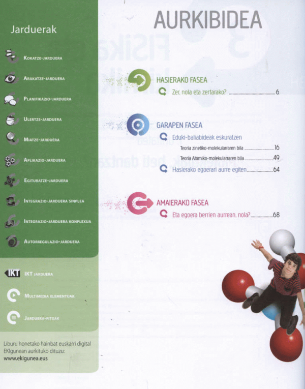 1. unitatea: Molekulak beti dantzan?; 2. unitatea: Molekulen orkestra; 3. unitatea: Elektroien zirrara
