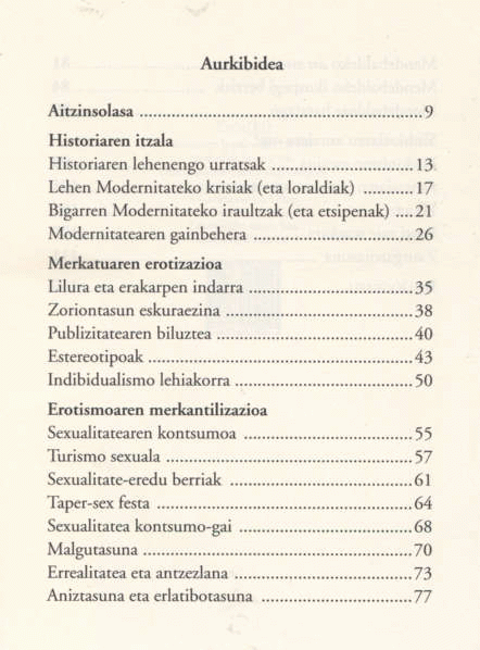 Entsegu-lan honek erotismoaren merkantilizazioa eta merkatuaren erotizazioa jorratzen ditu, biak uztartuz prozesu orokor baten bi alde banaezinak direlakoan. Lanak pentsarazten digu gure garai honetako kapitalismoari dagokiola halako lege nagusi bat, sedukzioarena nonbait, eta lege hura, aipatu barik ere, zertan den azaltzeko bidea jorratzen laguntzen digu. Merkatuak Erosaren potentzia barneratu duen eran, badirudi sexua eta erotismoa, oro har, merkatuaren gai kutuna bihurtu direla. Nonbait, ez dakigu bizitzen sexua eta erotismoa salerosketatik kanpo, kontsumoaren logikatik kanpo. Eta gertaera horietan denetan, lanak boterearen konfigurazio zahar eta berrien zantzuak ikusten laguntzen digu.Bai gizarteari, bai norberari, merkantilizazioa ezarri erronkak, esate baterako zoriontasun eta osotasun lortezinak baina aldi berean ezinbestekoak, begi bistan jartzen saiatu da egilea, baita norainoko eragina izan duten argitzen ere. Eta halaxe, galdera asko iradoki eta irekita uzten dizkigu saioak, gure iritziz ez hutsalena honakoa: zeinek kolonizatu du zein, erotismoak merkatua ala merkatuak erotismoa? Ongi jakin arren merkatuak aspaldi kolonizatu zuela gure bizi-mundua.