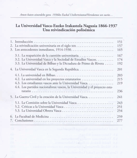 1866tik aurrera euskal erakundeek eta gizarteak unibertsitatea eskatu zieten behin eta berriz Espainiako gobernuei, baina aldarrikapen hori ez zen gauzatu 1936ko azarora arte, euskal autonomiarekin batera. Medikuntza Fakultatea baino ez zen eratu eta Bilbo erortzearekin batera itxi zituen bere ateak. Auzi horrek ondo erakusten du Euskal Herriaren konplexutasuna, bai lurraldeen arteko harremanei dagokienez, bai eta gizarte-taldeen eta indar politikoen arteko harremanei dagokienez ere. Baina, era berean, erakunde horiek lankidetzarako erakutsi duten gaitasunaren adibide egokia ere bada.