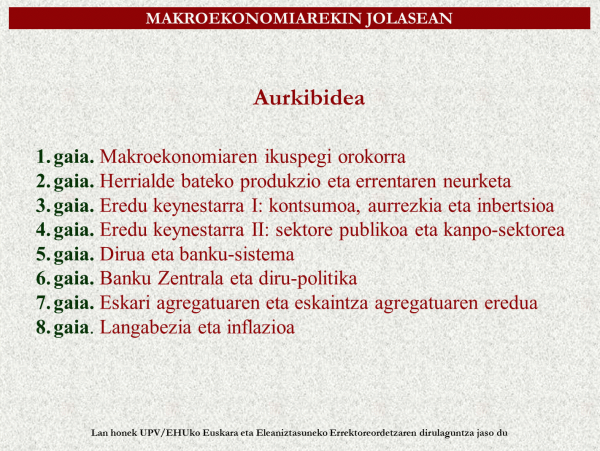 Lan honen helburua makroekonomiaren kontzeptu, tresna eta politika nagusiak azaltzea eta haiekin jolastea da, hots, PowerPoint programa lagun dugula modu jostagarrian zientzia makroekonomikoaren oinarriez jabetzea: aldagai makroekonomiko garrantzitsuenak (kontsumoa, aurrezkia, inbertsioa, gastu publikoa, esportazioak, inportazioak, barne produktu gordina, etab.) deskribatu eta elkarren arteko loturak azaltzen ditugu, zerga-politikaz eta diru-politikaz ari gara, langabezia eta inflazioari buruzko ideia orokorrak aurkezten zaizkigu, etab. Horretarako, PowerPoint programan funtsatutako material dinamiko, koloretsu eta jostagarria darabilgu