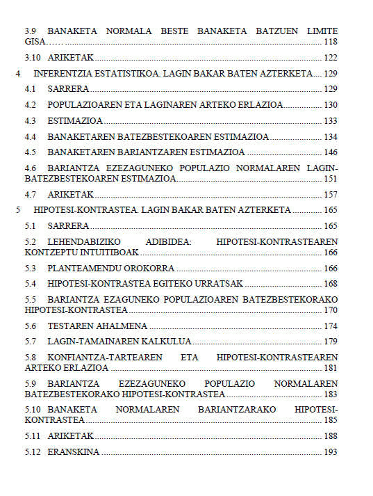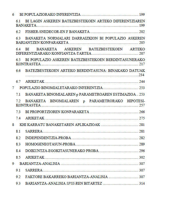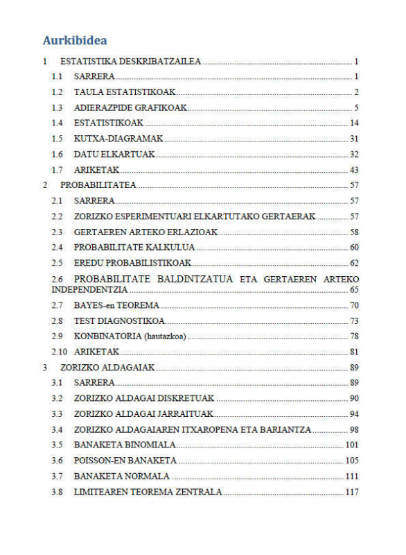 Kapitulu ezberdinetan, Bioestatistikako oinarrizko kontzeptuak azaldu eta adibideen bidez lantzen dira. Gure helburu nagusia izan da ikasleak bioestatistika nola aplikatu eta lorturiko emaitzak nola interpretatzeaz jabetzea. Eta horretarako, matematiketako formulez baino harago, Biologia eta Osasun arloetako adibideez baliatu gara, era erraz batean ikasleek uler ditzaten Bioestatistikako oinarrizko kontzeptu horiek.