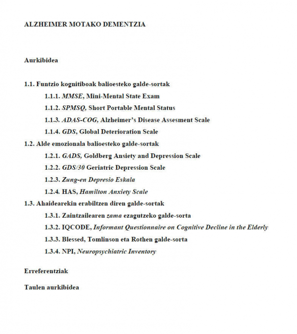 Lanaren helburu nagusiak bi dira: batetik, euskal ikaslea zahartzaroaren jakintza arloarekin lotuta dauden ezagutza interesgarrietara hurbiltzea. Bestetik, zahartzaro patologikoaren barnean Alzhemer motako dementzia balioesteko hainbat arloetako galde-sortak azaltzea. Hain zuzen ere, arlo kognitiboan, emozionalean eta ahaideekin erabiltzen diren galde-sortak ezagutaraztea.