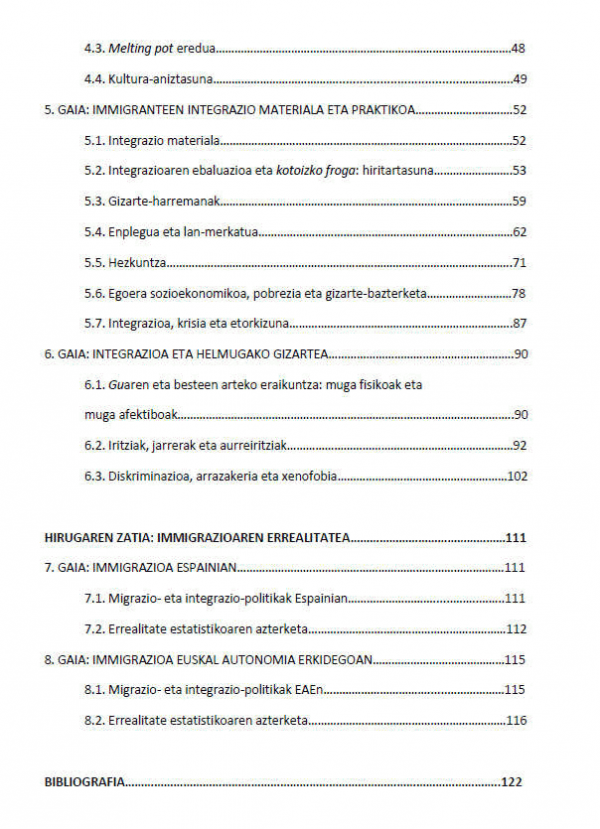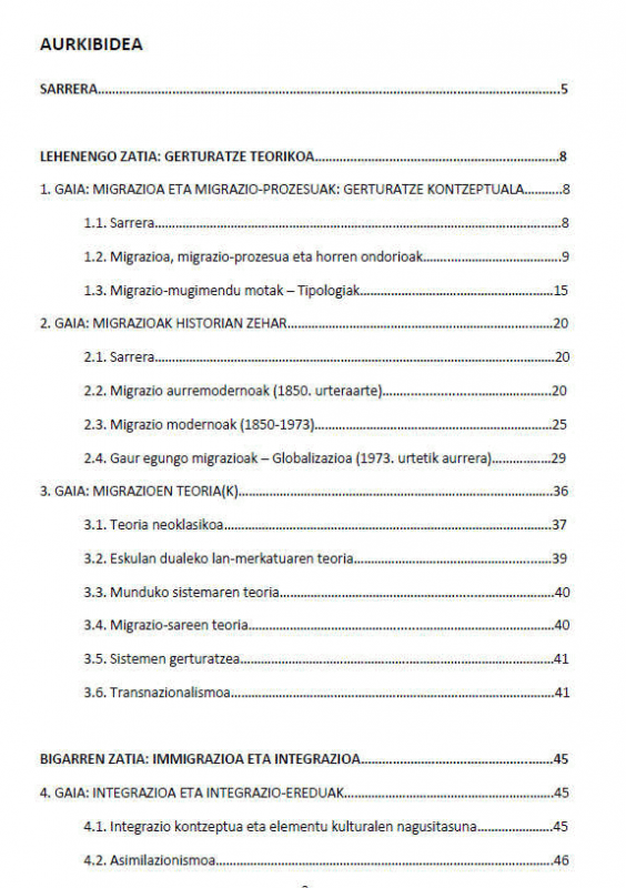 Migrazioa gizakiaren jaiotzatik bertatik gertatzen den fenomenoa da; bere baitan eta bere izaeran dago mugikortasuna eta zenbaitetan leku batetik bestera joateko beharra. Gaur egun ere ukaezina da migrazioen garrantzia; munduko populazioaren % 3a bere jaioterria ez den beste lurralde batean bizi dela jotzen da.Gurean ere garrantzia hartu du nazioartetik datorren immigrazioak azken urte hauetan, eta gero eta nabarmenagoa da gure gizartean migrazioek dakarten aniztasuna. Era berean, migrazioekin erabat lotuta agertzen zaizkigu gaur egungo soziologian azterketagai nagusiak diren hainbat gai: globalizazioa, lan-merkatua, aniztasunaren kudeaketa, gizarte-bazterketa, familiaren egitura, estatuaren berrantolaketa, etab.Gai hauek guztiak kontuan harturik, diziplinanitzeko ekarpena egiten saiatuko da liburu hau. Hainbat ataletan garrantzia izango dute bilakaera historikoak edota gerturatze kontzeptualak; beste batzuetan, berriz, gaur egungo eztabaidak eta datuak plazaratuko dira. Horrela, gaiak gure egunerokotasunean duen garrantzia azpimarratuko dugu, komunikabideetan zein gizartean aurki daitezkeen iritziak planteatuko ditugu, eta era kritiko batean eztabaidatu.