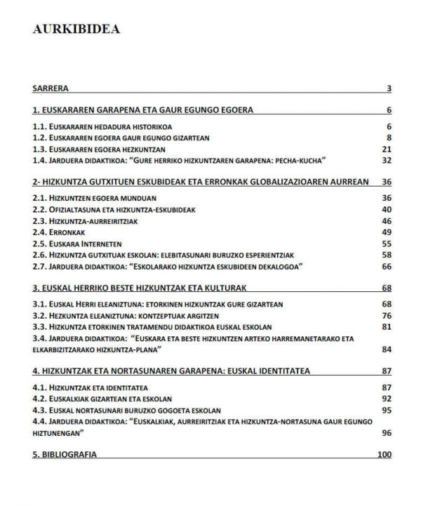 Azken urte hauetan hamaika soinu ezberdin entzuten dira gure herrietan, hirietan eta auzoetan; ehunka hizkuntza ofizialekin bizi dira. Baina herrialde txiki honek badu altxor berezi bat ere, euskara, eta handik eratortzen den euskal identitatea. Hortaz, hizkuntza gutxitu batek ofizialtasuna partekatzen du munduan eragin handienetakoa duten zazpi hizkuntzetako batekin, gaztelaniarekin, eta beste ehunka hizkuntza etorkinekin ere bizi behar du. Horrek egoera berezia sortzen du: alegia, errealitate aberatsa, bizia eta emankorra izan arren, aniztasunak ez du, askotan, bere kabuz arrakastarik izaten gizartean. Guzti horretan hezkuntzak badu zer eginik. Eskolaren ardura da, besteak beste, euskal biztanleei irakastea bai eleaniztasuna bai euskara errespetatzen, eta, gainera, hizkuntza gutxituari arnasbideak eman behar dizkio. Aldi berean, beste hizkuntzak errespetuz tratatzen ere irakatsi behar du: hau da, eskolaren helburua izan beharko litzateke geurea dena ulertzea, ikastea eta maitatzea; baina begiak mundura ere zabaldu behar dira, geurea besteei aurkezteko eta besteena gureganatzeko. Hots, gaur egungo haurretan, euskal identitatea garatu behar da, eta, era berean, munduko beste herrialdeetatik geurera etorri diren guztien hizkuntzen eta kulturen errespetua bermatu. Laburbilduz, elkartasunean oinarritzen den gizarte bat eraikitzeko, etorkizuneko gizon-emakume integralak egin behar ditu eskolak.