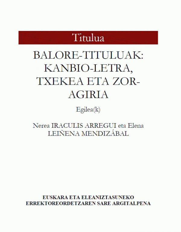 Balore-tituluak [Interneteko baliabidea] / Nerea Iraculis Arregui eta Elena Leiñena Mendizábal : Kanbio-letra, txekea eta zor-agiria
