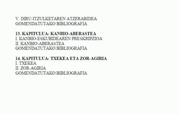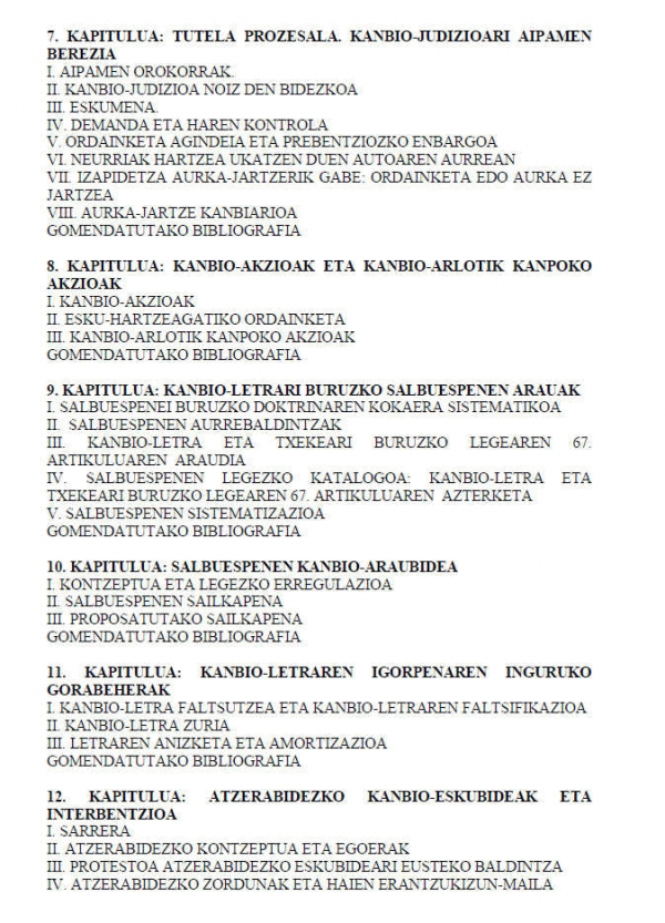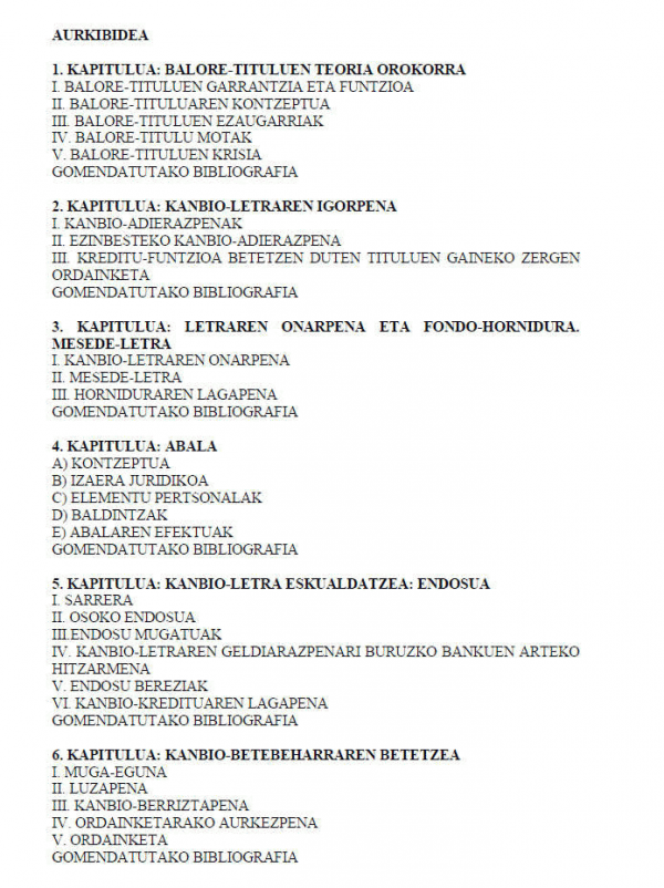 Liburu honetan atal hauek agertzen dira:- Balore-tituluak: kontzeptua, balore-titulu bereziak eta sailkapena.- Kanbio-letra: igorpena, ordezkaritza, onarpena, endosua, kausazko oinarriak, salbuespenak (bazterrezinak eta baztergarriak), letra faltsua, letra zuria, letra amortizatzea, abala, atzerabidezko kanbio-eskubideak, protestoa, letra kaltetua, esku-hartzea eta kanbio-aberastea.- Txekea eta zor-agiria: kontzeptua, ezaugarriak eta berezitasunak.