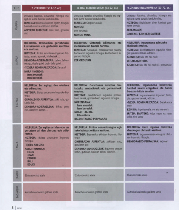 Ikaslearen liburuak sei unitate didaktiko ditu. Unitate bakoitzean hiru helburu proposatzen dira, eta helburu bakoitza ekintza komunikatibo bat da. Ekintza horietan bizitza errealeko gaiak, egoerak eta testuinguruak islatzen dira; ikasleak, jarduera komunikatiboen bitartez, hizkuntza modu naturalean erabiltzeko aukera izango du. Ezinbestekoa da testuen esanahia ulertzea ekintza zuzen eta egoki burutzeko. Entzumenean oinarritutako jarduerek berebiziko garrantzia hartzen dute. Guztira, berariaz sortutako 80 audio biltzen dira sei unitateetan.Unitate bakoitza egiteko, 20 ordu aurreikusi dira (Ikaslearen liburua + Lan-koadernoa). Dena dela, ikasle guztiek ez dituzte berdin baliatuko eskainiko zaizkien aukera guztiak, norbanakoaren beharrak eta premiak ezberdinak izango baitira uneoro.Ikaslearen liburuko erantzunak eta transkripzioak aparte eskaintzen dira (liburuaren osagarri moduan), ikasleak eskura izan ditzan. Ahozko testu guztien transkripzioak ere jaso dira.