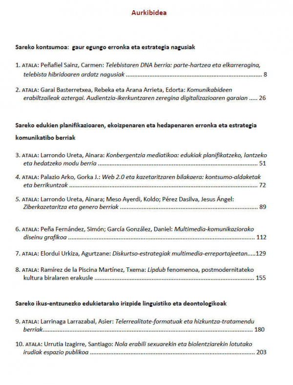 Hiru multzo nagusi bereizi ditugu liburuan: lehenengoan, sarean ohikoa den kontsumoa aztertzetik hasiko gara, kontsumo hori baita komunikazio-estrategien ardatz nagusietako bat. Bigarren multzo nagusian, edukien planifikazioaz, ekoizpenaz eta hedapenaz arituko gara, eta bereziki sareak eskaintzen dituen lan-tresna teknologiko eta komunikatibo berriak landuko ditugu. Azken multzoan, Interneteko edukiak hedatzeko orduan gogoan hartzen diren irizpide linguistikoak eta kode deontologikoak aztertuko ditugu.