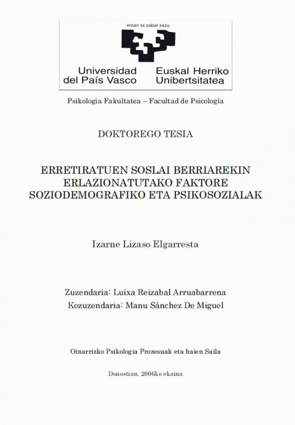 Erretiratuen soslai berriarekin erlazionatutako faktore soziodemografiko eta psikosozialak [Interneteko baliabidea] / Izarne Lizaso Elgarresta; zuzendaria, Luixa Reizabal Arruabarrena; kozuzendaria, Manu Sánchez De Miguel