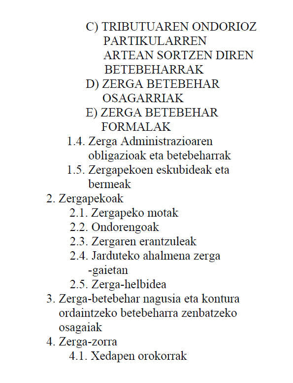 Edukia: I. Zerga Ordenamenduaren printzipio orokorrak. 1. Printzipio orokorrak. 2. Zerga-arauak. II. Tributuak. 1. Xedapen orokorrak. 2. Zergapekoak. 3. Zerga-betebehar nagusia eta kontura ordaintzeko betebeharra zenbatzeko osagaiak. 4. Zerga-zorra.